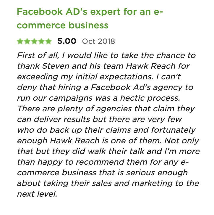 Hawk Reach is an international marketing agency that creates highly-profitable Facebook ad campaigns for e-commerce companies. We take the stress out of PPC advertising by increasing traffic, improving lead quality and boosting sales.